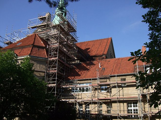 In den vergangenen Jahren wurde Stück für Stück die Fassade der Jakobikirche saniert. Begonnen wurde mit der Straßenseite, dann weiter im Norden und 2010 dann im Westen (die Südfassade steht derzeit noch aus). Aufgrund der komplizierten Dachkonstruktion mussten dafür aufwendige Gerüste gebaut werden, damit alle Wandbereiche rund um die Kirche erreicht werden können, um losen Putz zu entfernen und die Wände neu zu verputzen und zu streichen. Hierbei ergaben sich dann beim Blick auf oder vom Gerüst interessante Ausblicke.